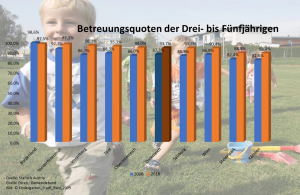 Im Kindergartenjahr 2018/2019 wurde in Österreich jedes vierte Kind unter drei in einem Kindertagesheim betreut. Darunter fallen Krippen und Kleinkindbetreuungseinrichtungen, Kindergärten, Horte und altersgemischte Betreuungseinrichtungen.Obwohl Oberösterreich mit einem Plus von 177,6 Prozent den höchsten Anstieg hatte, liegt es im österreichweiten Vergleich der Betreuungsquoten mit 16,5 Prozent an Das liegt erheblich unter dem österreichischen Durchschnitt von 26,5 Prozent.