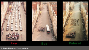 Fahrräder nehmen wesentlich weniger Platz ein als Autos oder öffentliche Verkehrsmittel und sind daher aus rein praktischen Gründen im Ortskern von Vorteil.