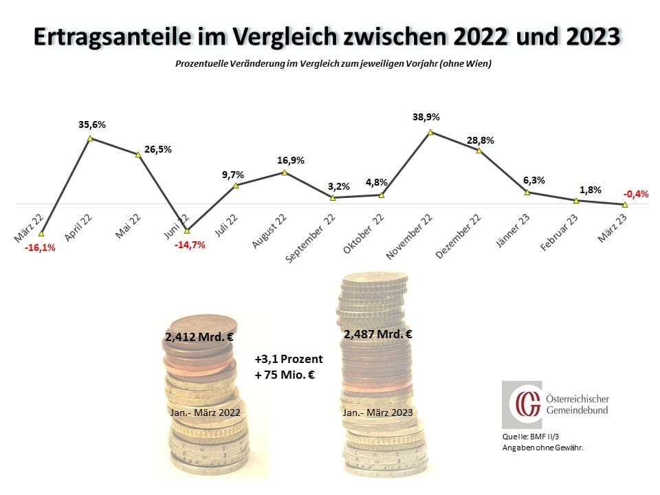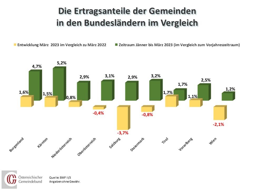 Wie schon zuletzt ist der wesentliche Grund, weswegen die Vorschüsse auf die Gemeindeertragsanteile im März 2023 gegenüber März 2022 österreichweit gesehen um 0,4 Prozent sinken, die Grunderwerbsteuer. So ist diese gemeinschaftliche Bundesabgabe, die jedoch zu knapp 94 Prozent den länderweisen Gemeinde-Ertragsanteilen zugeschlagen wird, im Monatsvergleich mit 2022 in Salzburg um über 30 Prozent eingebrochen, womit die dortigen März-2023-Vorschüsse mit -3,9 Prozent auch den höchsten Rückgang verzeichnen, gefolgt von der Gemeinde Wien (-2,1 Prozent), den Tiroler Gemeinden (-1,7 Prozent) sowie den oberösterreichischen und steirischen Gemeinden (-0,8 bzw. -0,4 Prozent). In den übrigen vier Bundesländern verzeichnen die März-Vorschüsse der Gemeinden ein kleines Plus zwischen 0,8 und 1,6 Prozent.