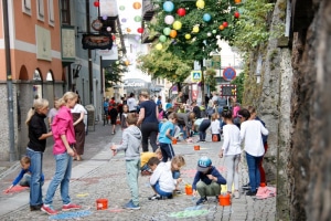 Schülerinnen und Schüler bemalten die Mittergasse im Zentrum von Saalfelden.©Stadtgemeinde Saalfelden