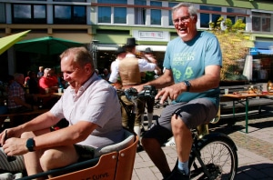 Bürgermeister Erich Rohrmoser (li.) und Mobilitätsstadtrat Ferdinand Salzmann probierten gemeinsam ein Lastenfahrrad aus. ©Stadtgemeinde Saalfelden