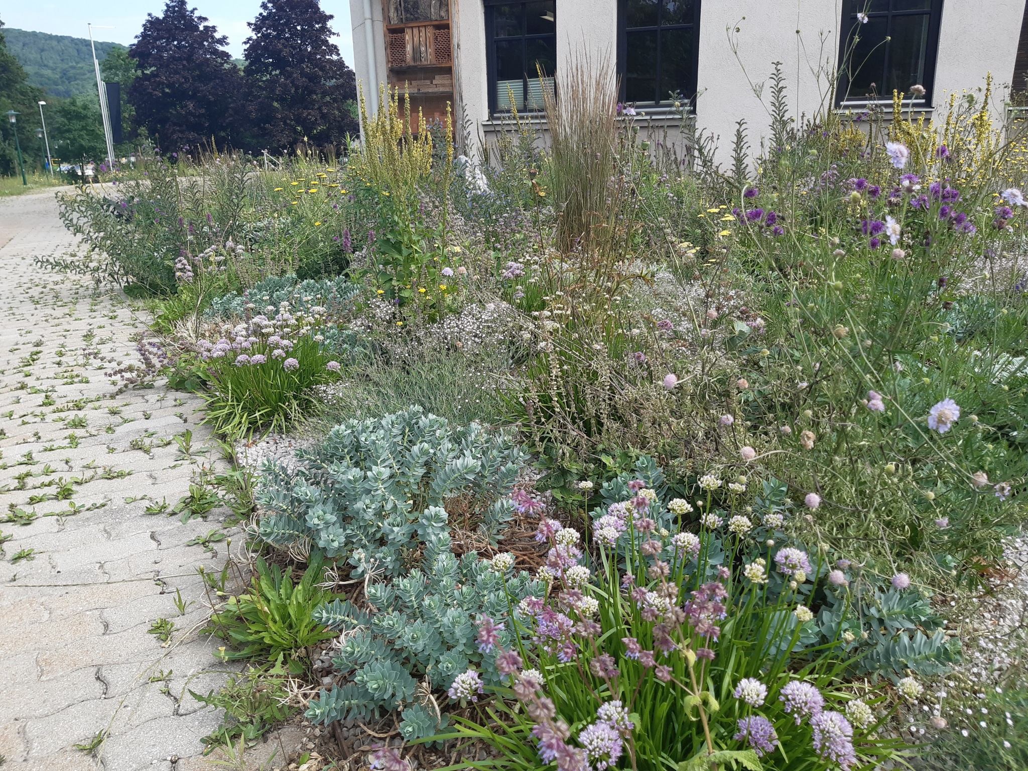 Die bunten Staudenrabatten sind insektenfreundlich, klimafit und pflegeextensiv. Um auch lange Trockenphasen gut zu überstehen, wurden die trockenheitsverträglichen Pflanzen in ein nährstoffarmes Substrat gesetzt. Dies entspricht den natürlichen Ansprüchen vieler trockenheitsverträglicher Stauden.  Dafür wurde der Boden 15-20 cm Boden abgetragen und mit 0/16 Kantkorn (gemischt mit etwas unkrauftfreiem Kompost) aufgefüllt. Zahlreiche insektenfreundliche Stauden wurden gesetzt, darunter Kugeldistel, Steppensalbei, Katzenminze, Echter Dost, Gelbe Resede, etc. Bei der Auswahl der Pflanzen wurden viele heimische Pflanzen gewählt, die auch hochspezialisierten Insekten eine Nahrungsquelle bieten. Breitenfurt leistet hiermit einen zukunftsweisenden Beitrag gegen das Insektensterben und den Rückgang der Artenvielfalt.