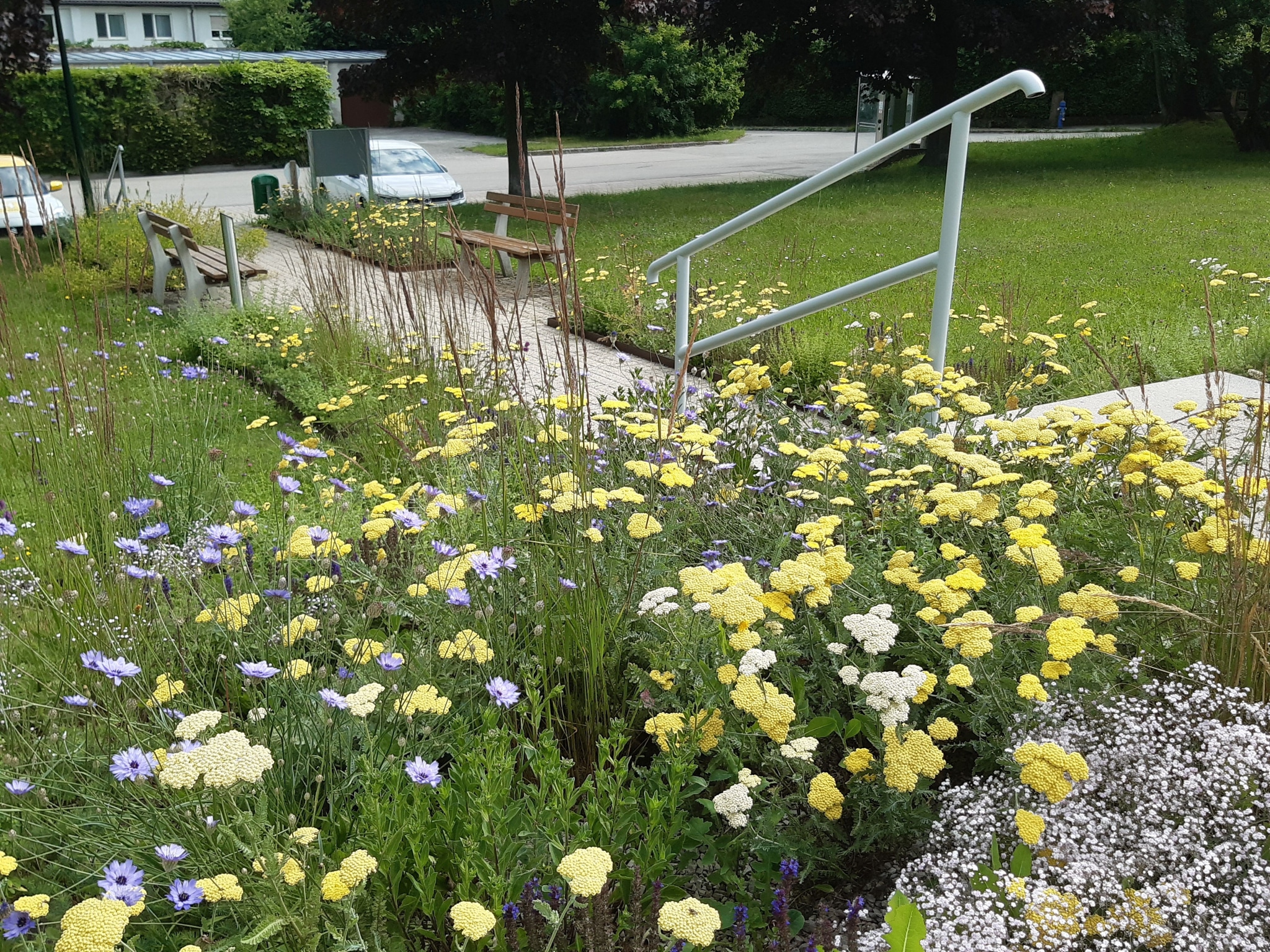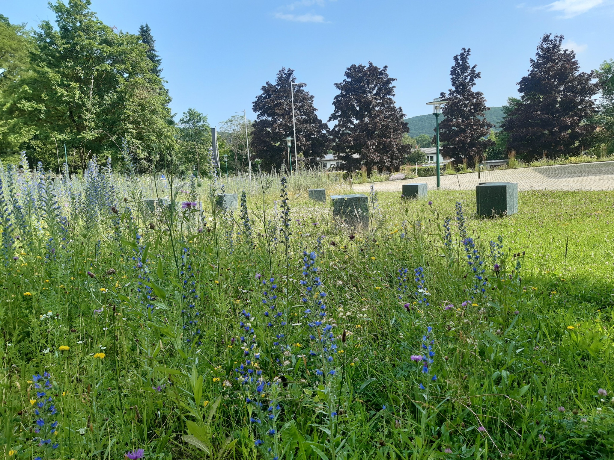 Ein großer Teil der Rasenflächen wurde umgebrochen und regionaltypisches Wildblumensaatgut ausgebracht. Mittlerweile erfreuen unzählige Blüten die Bürgerinnen und Bürger sowie die Insekten. Bei anderen bestehenden Rasenflächen wurde lediglich der Mährhythmus umgestellt. Sie werden nicht mehr so häufig gemäht und mit der Zeit etablieren sich mehr und mehr Wildkräuter wie Schafgarbe, Braunelle, Wegericharten etc. Der Rasen wird so – durch eine Pflegeumstellung – zum ökologisch wertvollen und trockenheitsverträglichen Kräuterrasen.
