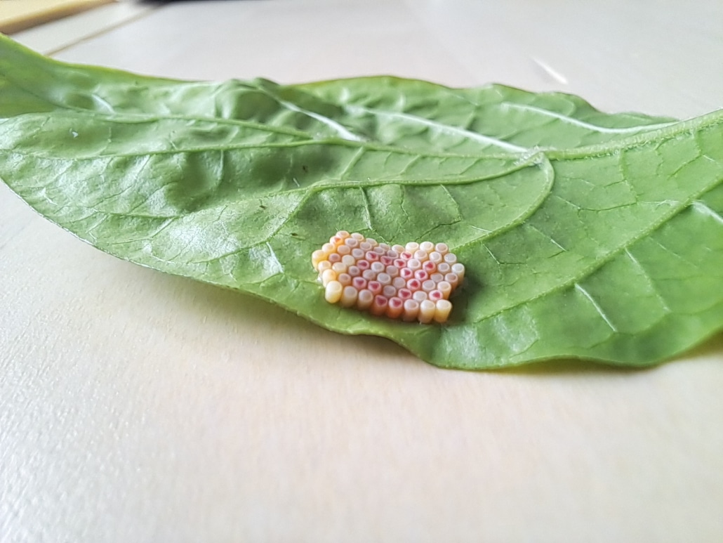 Auf der Blattunterseite werden die Eier in symmetrischen Reihen abgelegt.