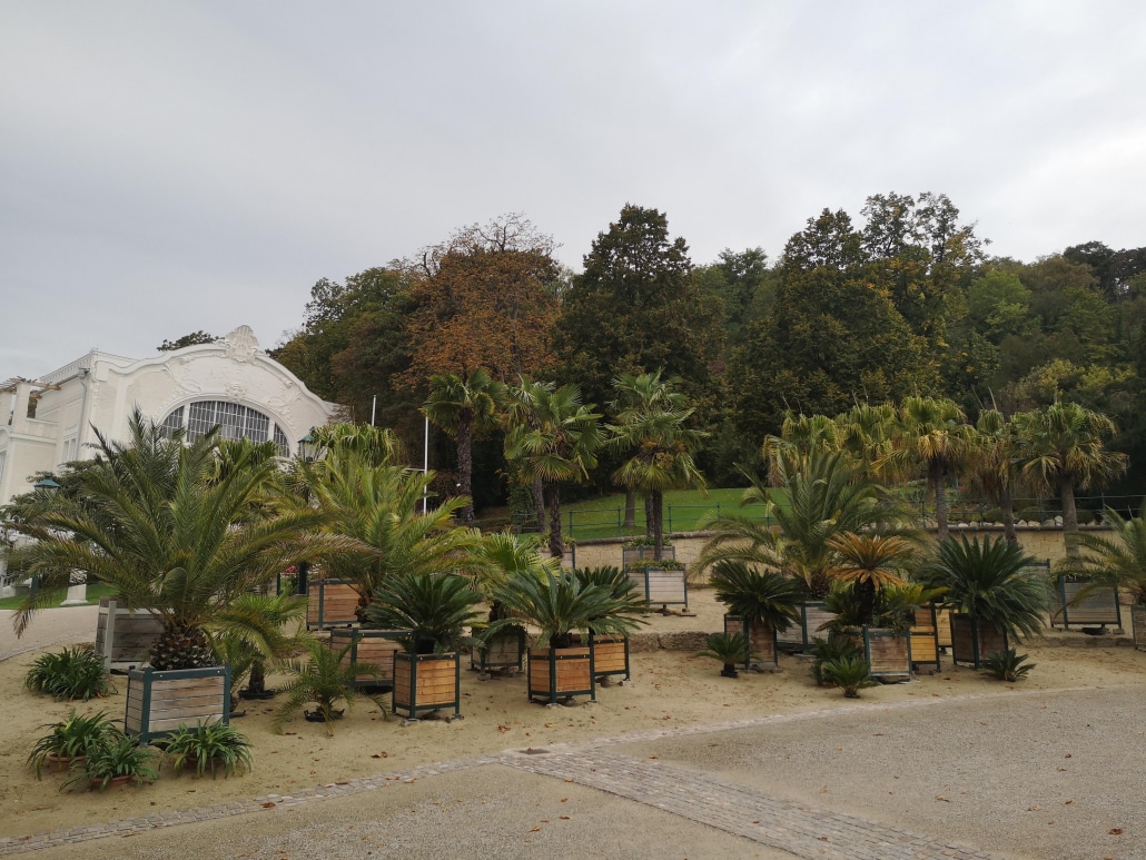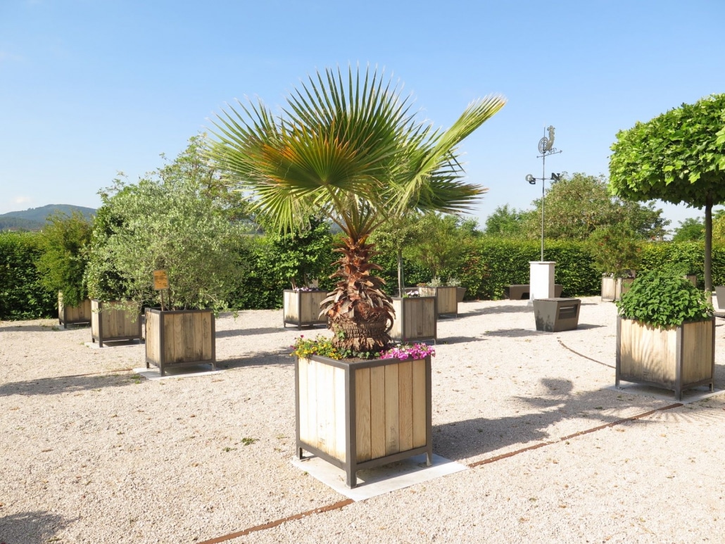 Verschiedene exotische Arten werden als Kübelpflanzen gehalten, wie hier im Vordergrund eine Palme.