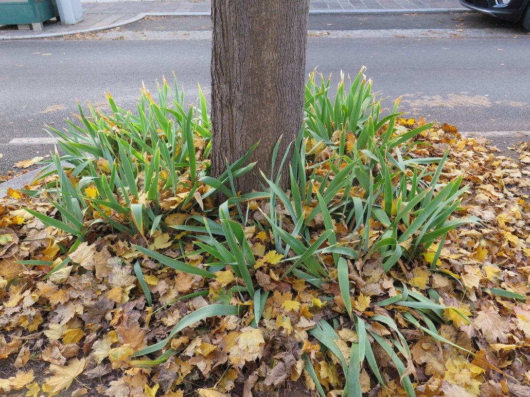 In ruhigeren Gemeindebereichen kann das Laub auch auf den Beeten liegen bleiben. Bei Hecken und Sträuchern werden die Blätter darunter gekehrt. Durch die natürliche Verrottung entsteht ein Nährstoffkreislauf, der ohne zusätzliche Düngung auskommt.