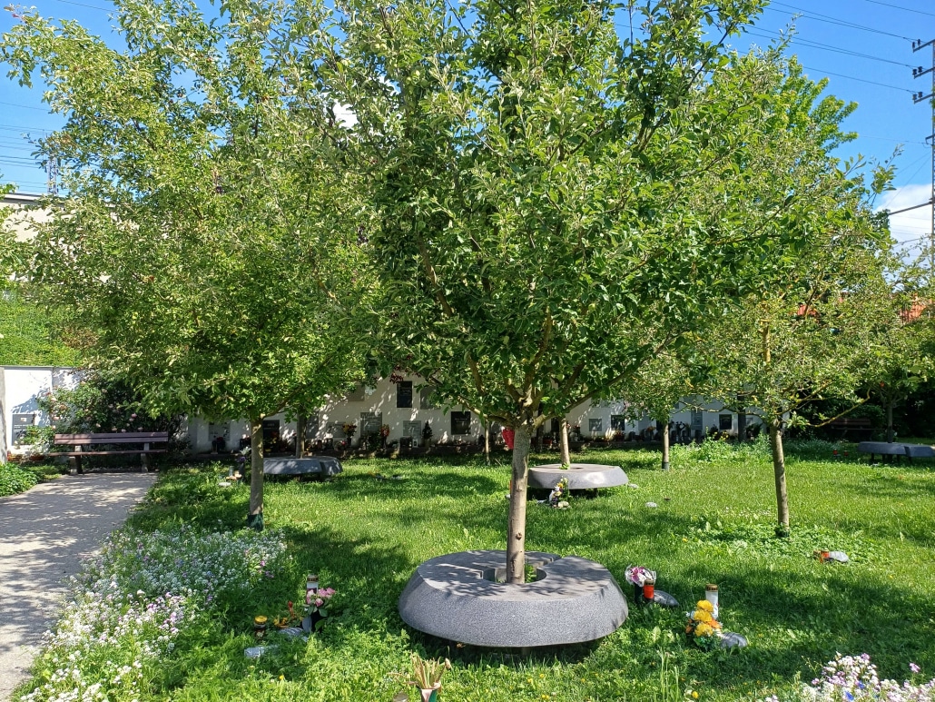 Eine schöne Idee: Mit Apfelbäumen als Sinnbild für die Vergänglichkeit des Lebens gestalteter Urnenbereich. Zu finden am St. Barbara Friedhof in Linz. Copyright: „Natur im Garten“