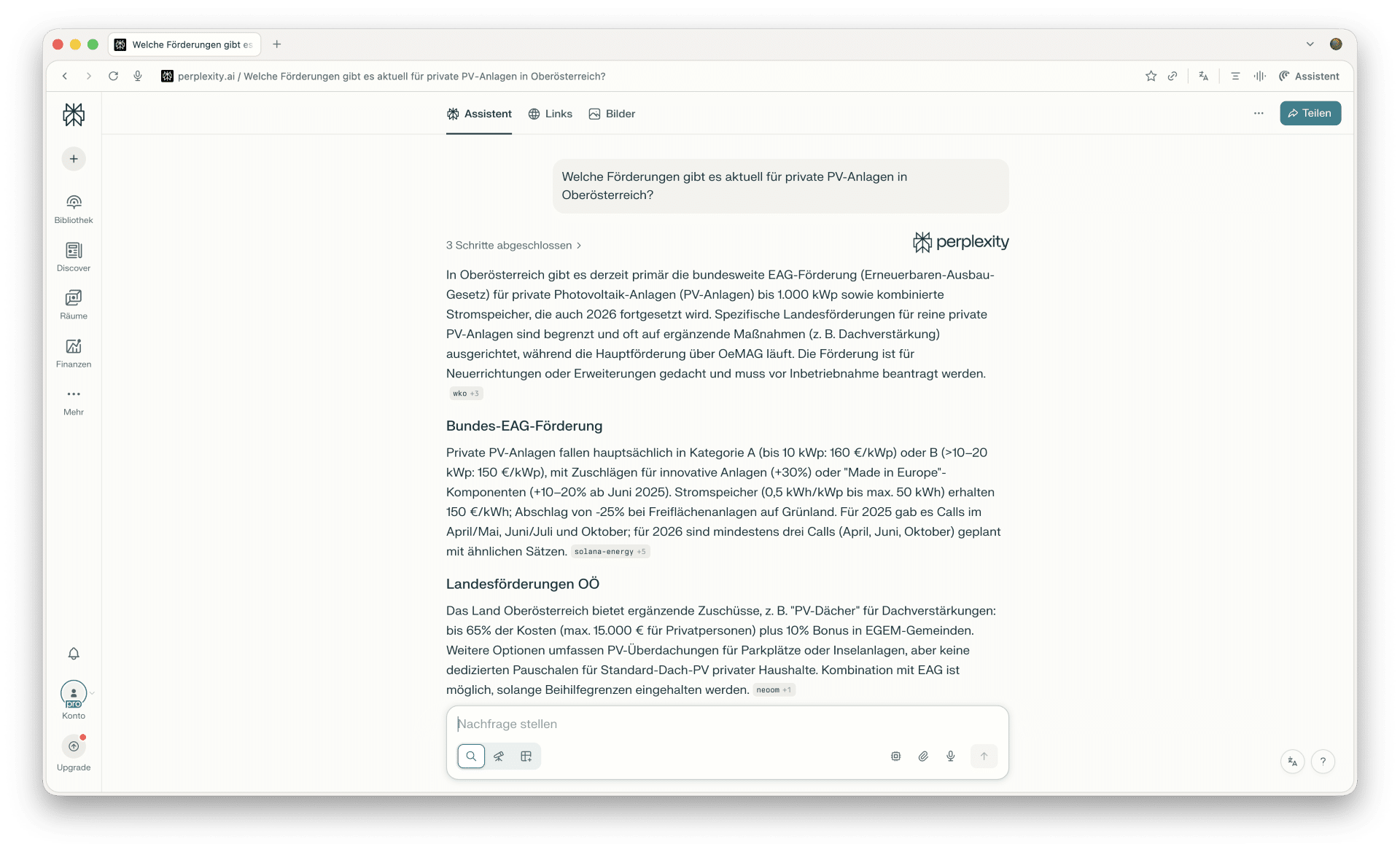 Was wäre, wenn Sie stattdessen einfach fragen könnten: „Welche Förderungen gibt es aktuell für private PV-Anlagen in Oberösterreich?“ – und eine Antwort bekämen, die nicht nur verständlich formuliert ist, sondern auch gleich die Quellen mitliefert? Genau das kann Perplexity.