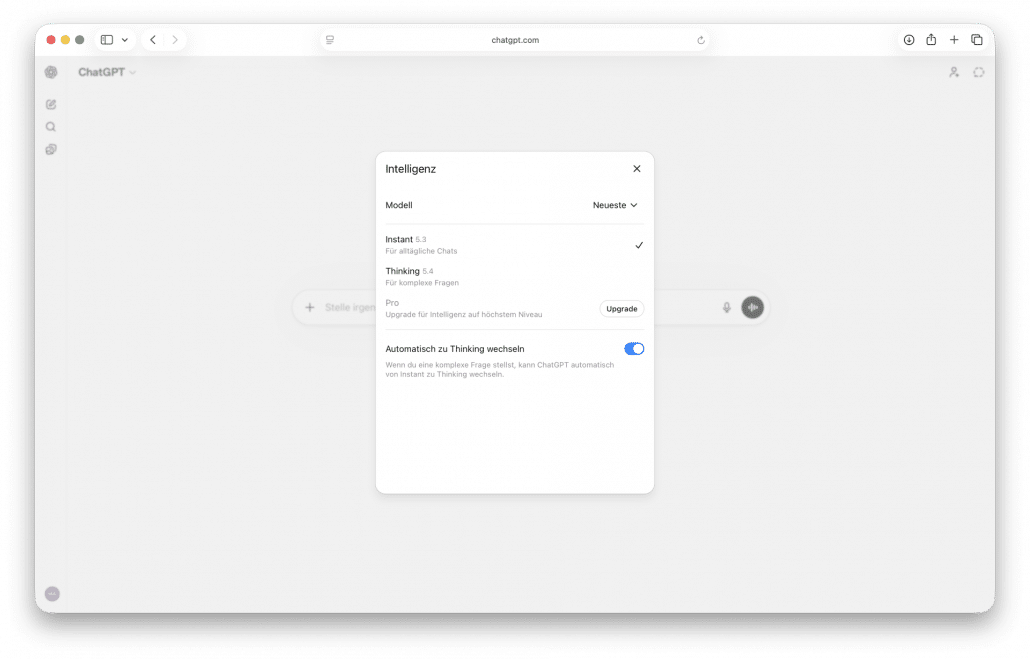 Praktisch: Es gibt auch einen Schalter „Automatisch zu Thinking wechseln”. Wenn dieser aktiviert ist, erkennt ChatGPT selbst, wann eine Frage komplex genug ist, und schaltet automatisch in den Denkmodus um.