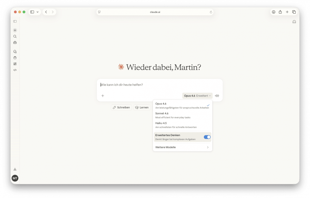 Klicken Sie auf den Modellselektor rechts neben dem Textfeld (z.B. „Sonnet 4.6″). Im Dropdown sehen Sie den Schalter „Erweitertes Denken” – „Denkt länger bei komplexen Aufgaben”. Schalten Sie ihn ein. Besonders praktisch: Nach jeder Antwort können Sie den Denkprozess aufklappen und nachlesen, wie Claude zur Lösung gekommen ist