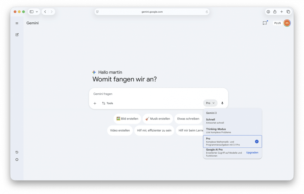 Klicken Sie auf das Modell-Dropdown rechts unten im Textfeld. Unter „Gemini 3″ wählen Sie statt „Schnell” den „Thinking-Modus” – „Löst komplexe Probleme”. Gemini aktiviert dann den Denkprozess für Ihre Anfragen.