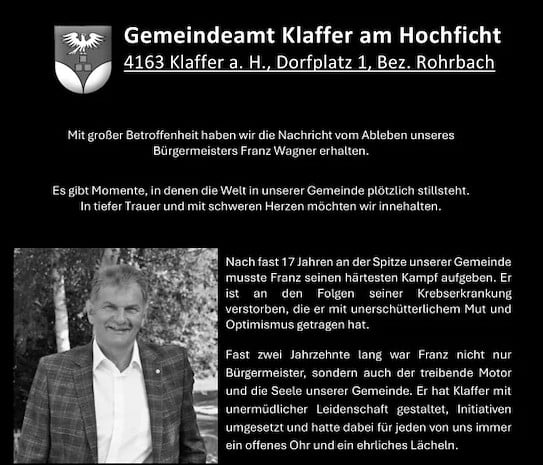 Es waren traurige Nachrichten, die die Gemeinde Klaffer am Hochficht Mitte April erreichten: Der Langzeit-Bürgermeister der oberösterreichischen Gemeinde, Franz Wagner, ist vor wenigen Tagen einer schweren Krebserkrankung erlegen. Zwei Chemotherapien verliefen leider erfolglos.