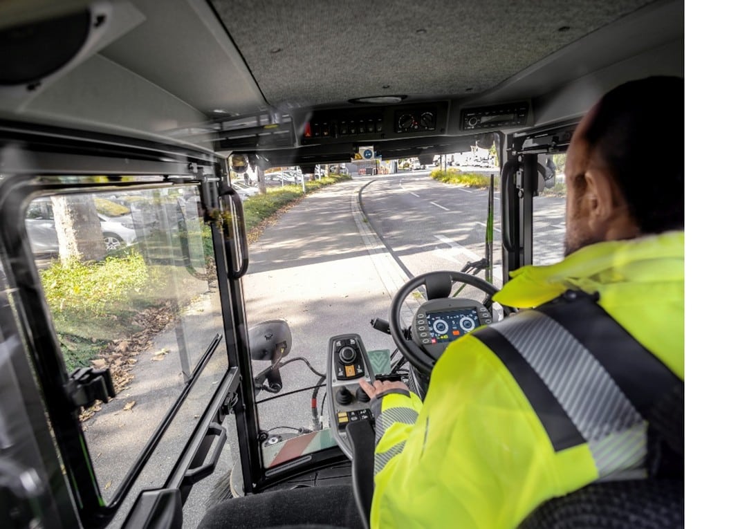 Die ergonomisch gestaltete Doppelsitzerkabine mit 360°-Verglasung, elektrisch beheizbarer Frontscheibe und zentralem Multifunktionsdisplay sorgt für die marktweit beste Rundumsicht und maximalen Bedienkomfort. Der Bediener sieht in der Blickachse auf seinen Kehrbesen alle benötigten Informationen, ohne den Kopf weg vom Arbeitsbereich wenden zu müssen.
