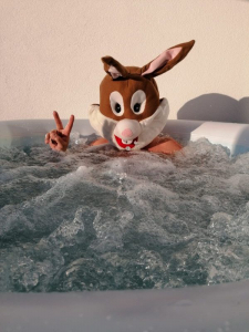 Nach einem langen Tag Osternesterl-Verteilen braucht auch der Osterhase eine Auszeit. Die Abkühlung kam bei den warmen Temperaturen wohlverdient. ©Club Pali_Christian Strahner