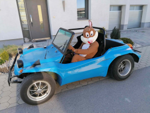 Der moderne Osterhase muss nicht mit Nesterl vollgeladen umherhoppeln – in einem Buggy ging es von Haus zu Haus. Christian Strahner ist nicht nur Teilzeit-Osterhase, sondern auch Nikolaus. Als solcher will er auch im Winter 2020 wieder Geschenke an die braven Kinder verteilen – wenn’s sein muss, dann mit Corona-Vorsichtsmaßnahmen. ©Club Pali_Christian Strahner