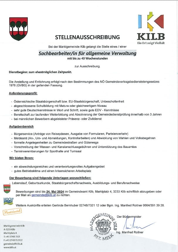 Um sich für diesen Job zu bewerben, sende deine Unterlagen per E-Mail an gemeinde@kilb.at