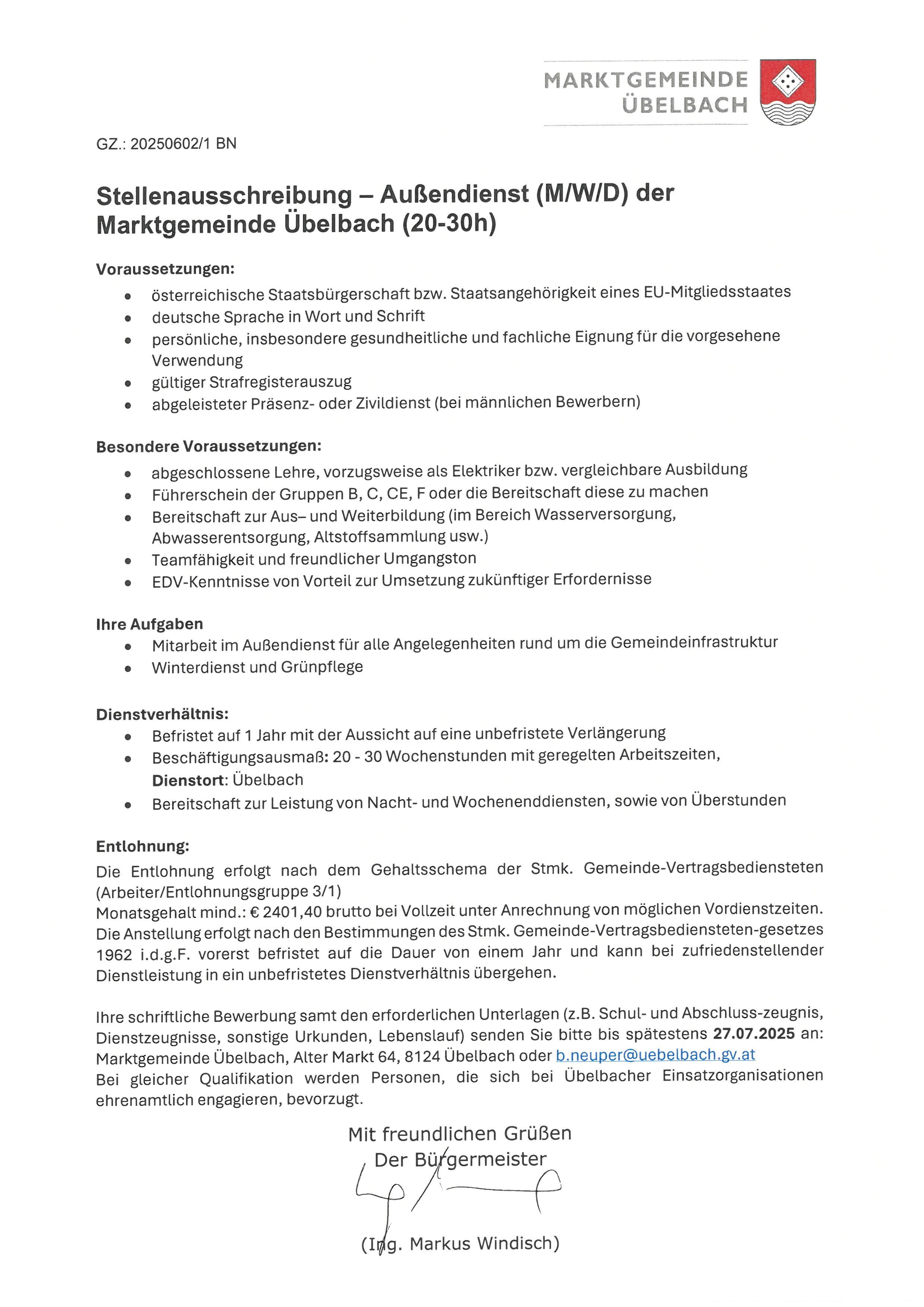 Um sich für diesen Job zu bewerben, sende deine Unterlagen per E-Mail an s.zoehrer@uebelbach.gv.at