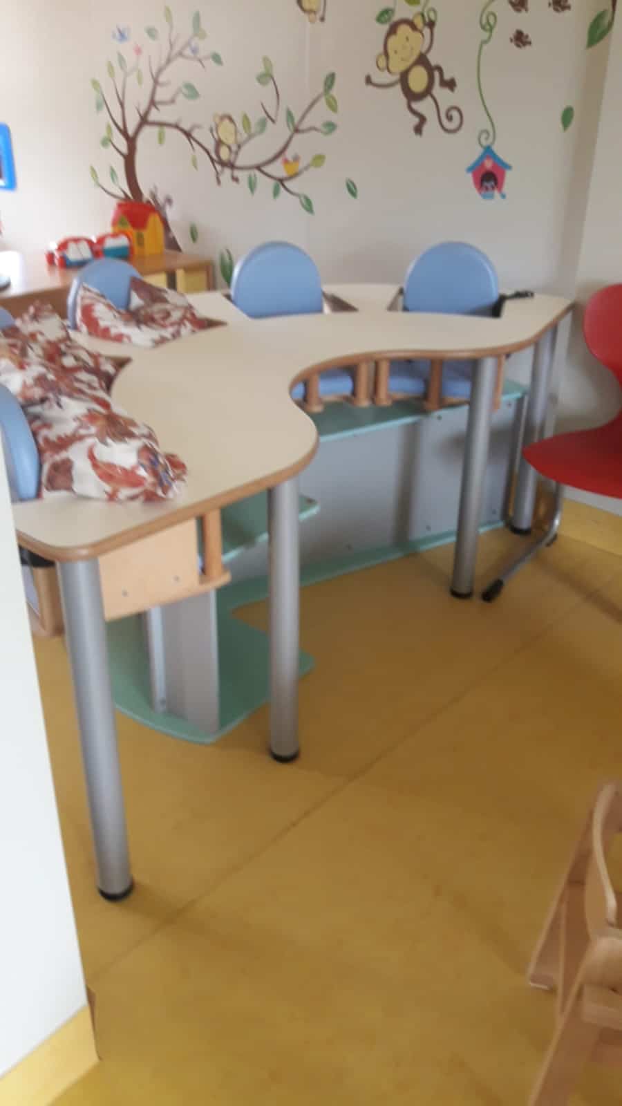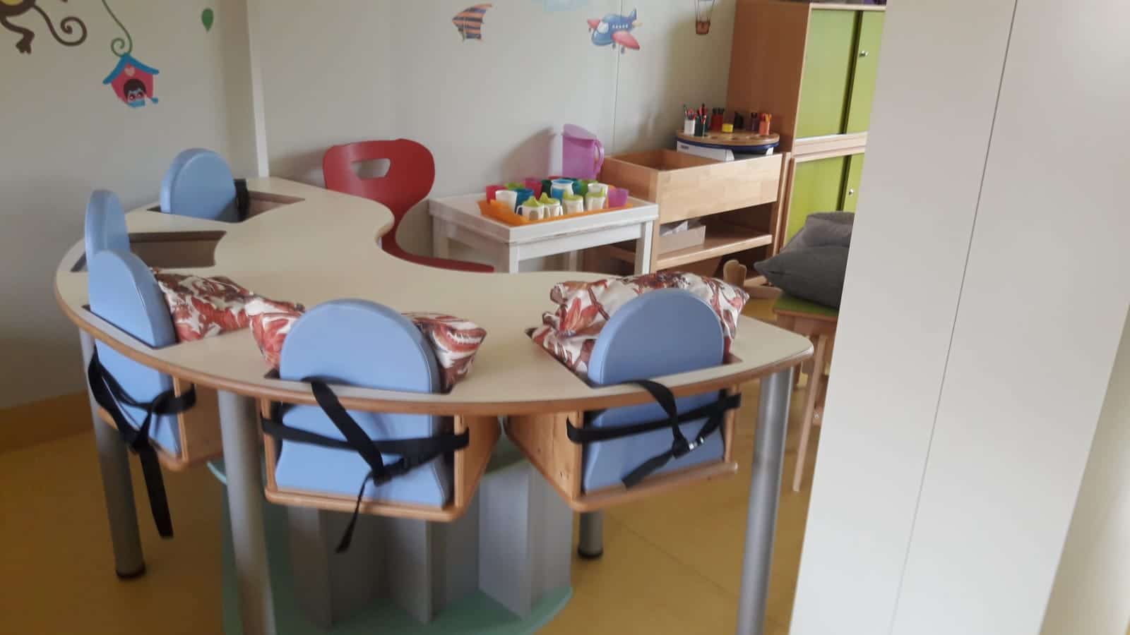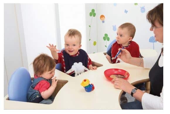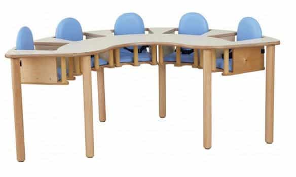 Diese durchdachten Hochstuhl-Tisch-Kombinationen bieten Platz für bis zu 5 Krippenkinder und eignen sich ideal für Mahlzeiten, kreative Aktivitäten und vieles mehr. Die Sitzplätze sind fest mit dem Tisch verbunden – so bleibt der Abstand zu jedem Kind gleich, was das Füttern und Anleiten deutlich erleichtert.